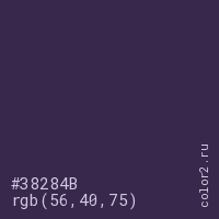 Цвет #38284B в цветовой модели RGB обозначается тремя октетами (56, 40, 75) в десятичном формате и #38284B в шестнадцатиричном (hex) формате, которые являются интенсивностью красного 56 (hex 38), интенсивность зелёного 40 (hex 28) и интенсивность синего 75 (hex 4B).