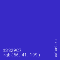 Цвет #3829C7 в цветовой модели RGB обозначается тремя октетами (56, 41, 199) в десятичном формате и #3829C7 в шестнадцатиричном (hex) формате, которые являются интенсивностью красного 56 (hex 38), интенсивность зелёного 41 (hex 29) и интенсивность синего 199 (hex C7).