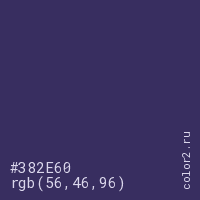 Цвет #382E60 в цветовой модели RGB обозначается тремя октетами (56, 46, 96) в десятичном формате и #382E60 в шестнадцатиричном (hex) формате, которые являются интенсивностью красного 56 (hex 38), интенсивность зелёного 46 (hex 2E) и интенсивность синего 96 (hex 60).