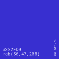 Цвет #382FD0 в цветовой модели RGB обозначается тремя октетами (56, 47, 208) в десятичном формате и #382FD0 в шестнадцатиричном (hex) формате, которые являются интенсивностью красного 56 (hex 38), интенсивность зелёного 47 (hex 2F) и интенсивность синего 208 (hex D0).