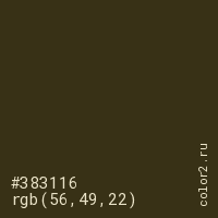 Цвет #383116 в цветовой модели RGB обозначается тремя октетами (56, 49, 22) в десятичном формате и #383116 в шестнадцатиричном (hex) формате, которые являются интенсивностью красного 56 (hex 38), интенсивность зелёного 49 (hex 31) и интенсивность синего 22 (hex 16).