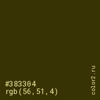 Цвет #383304 в цветовой модели RGB обозначается тремя октетами (56, 51, 4) в десятичном формате и #383304 в шестнадцатиричном (hex) формате, которые являются интенсивностью красного 56 (hex 38), интенсивность зелёного 51 (hex 33) и интенсивность синего 4 (hex 04).