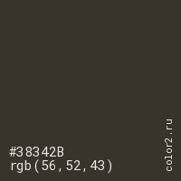 Цвет #38342B в цветовой модели RGB обозначается тремя октетами (56, 52, 43) в десятичном формате и #38342B в шестнадцатиричном (hex) формате, которые являются интенсивностью красного 56 (hex 38), интенсивность зелёного 52 (hex 34) и интенсивность синего 43 (hex 2B).