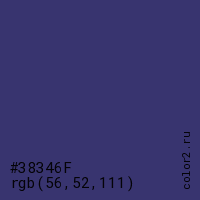Цвет #38346F в цветовой модели RGB обозначается тремя октетами (56, 52, 111) в десятичном формате и #38346F в шестнадцатиричном (hex) формате, которые являются интенсивностью красного 56 (hex 38), интенсивность зелёного 52 (hex 34) и интенсивность синего 111 (hex 6F).