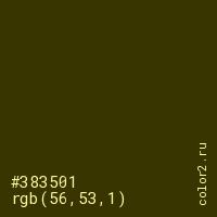 Цвет #383501 в цветовой модели RGB обозначается тремя октетами (56, 53, 1) в десятичном формате и #383501 в шестнадцатиричном (hex) формате, которые являются интенсивностью красного 56 (hex 38), интенсивность зелёного 53 (hex 35) и интенсивность синего 1 (hex 01).