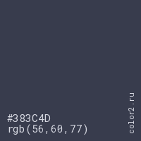 Цвет #383C4D в цветовой модели RGB обозначается тремя октетами (56, 60, 77) в десятичном формате и #383C4D в шестнадцатиричном (hex) формате, которые являются интенсивностью красного 56 (hex 38), интенсивность зелёного 60 (hex 3C) и интенсивность синего 77 (hex 4D).