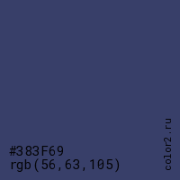 Цвет #383F69 в цветовой модели RGB обозначается тремя октетами (56, 63, 105) в десятичном формате и #383F69 в шестнадцатиричном (hex) формате, которые являются интенсивностью красного 56 (hex 38), интенсивность зелёного 63 (hex 3F) и интенсивность синего 105 (hex 69).