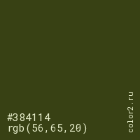 Цвет #384114 в цветовой модели RGB обозначается тремя октетами (56, 65, 20) в десятичном формате и #384114 в шестнадцатиричном (hex) формате, которые являются интенсивностью красного 56 (hex 38), интенсивность зелёного 65 (hex 41) и интенсивность синего 20 (hex 14).