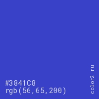 Цвет #3841C8 в цветовой модели RGB обозначается тремя октетами (56, 65, 200) в десятичном формате и #3841C8 в шестнадцатиричном (hex) формате, которые являются интенсивностью красного 56 (hex 38), интенсивность зелёного 65 (hex 41) и интенсивность синего 200 (hex C8).