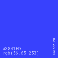 Цвет #3841FD в цветовой модели RGB обозначается тремя октетами (56, 65, 253) в десятичном формате и #3841FD в шестнадцатиричном (hex) формате, которые являются интенсивностью красного 56 (hex 38), интенсивность зелёного 65 (hex 41) и интенсивность синего 253 (hex FD).