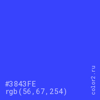 Цвет #3843FE в цветовой модели RGB обозначается тремя октетами (56, 67, 254) в десятичном формате и #3843FE в шестнадцатиричном (hex) формате, которые являются интенсивностью красного 56 (hex 38), интенсивность зелёного 67 (hex 43) и интенсивность синего 254 (hex FE).