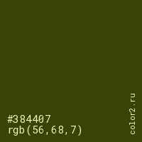 Цвет #384407 в цветовой модели RGB обозначается тремя октетами (56, 68, 7) в десятичном формате и #384407 в шестнадцатиричном (hex) формате, которые являются интенсивностью красного 56 (hex 38), интенсивность зелёного 68 (hex 44) и интенсивность синего 7 (hex 07).