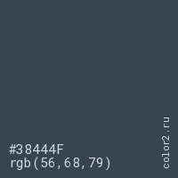 Цвет #38444F в цветовой модели RGB обозначается тремя октетами (56, 68, 79) в десятичном формате и #38444F в шестнадцатиричном (hex) формате, которые являются интенсивностью красного 56 (hex 38), интенсивность зелёного 68 (hex 44) и интенсивность синего 79 (hex 4F).