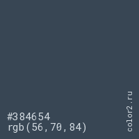 Цвет #384654 в цветовой модели RGB обозначается тремя октетами (56, 70, 84) в десятичном формате и #384654 в шестнадцатиричном (hex) формате, которые являются интенсивностью красного 56 (hex 38), интенсивность зелёного 70 (hex 46) и интенсивность синего 84 (hex 54).