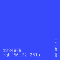 Цвет #3848FB в цветовой модели RGB обозначается тремя октетами (56, 72, 251) в десятичном формате и #3848FB в шестнадцатиричном (hex) формате, которые являются интенсивностью красного 56 (hex 38), интенсивность зелёного 72 (hex 48) и интенсивность синего 251 (hex FB).