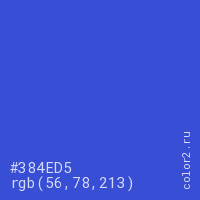 Цвет #384ED5 в цветовой модели RGB обозначается тремя октетами (56, 78, 213) в десятичном формате и #384ED5 в шестнадцатиричном (hex) формате, которые являются интенсивностью красного 56 (hex 38), интенсивность зелёного 78 (hex 4E) и интенсивность синего 213 (hex D5).
