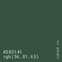 Цвет #385141 в цветовой модели RGB обозначается тремя октетами (56, 81, 65) в десятичном формате и #385141 в шестнадцатиричном (hex) формате, которые являются интенсивностью красного 56 (hex 38), интенсивность зелёного 81 (hex 51) и интенсивность синего 65 (hex 41).