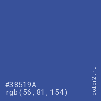 Цвет #38519A в цветовой модели RGB обозначается тремя октетами (56, 81, 154) в десятичном формате и #38519A в шестнадцатиричном (hex) формате, которые являются интенсивностью красного 56 (hex 38), интенсивность зелёного 81 (hex 51) и интенсивность синего 154 (hex 9A).