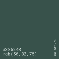 Цвет #38524B в цветовой модели RGB обозначается тремя октетами (56, 82, 75) в десятичном формате и #38524B в шестнадцатиричном (hex) формате, которые являются интенсивностью красного 56 (hex 38), интенсивность зелёного 82 (hex 52) и интенсивность синего 75 (hex 4B).