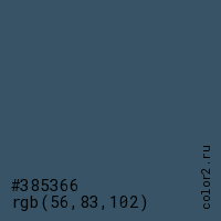 Цвет #385366 в цветовой модели RGB обозначается тремя октетами (56, 83, 102) в десятичном формате и #385366 в шестнадцатиричном (hex) формате, которые являются интенсивностью красного 56 (hex 38), интенсивность зелёного 83 (hex 53) и интенсивность синего 102 (hex 66).