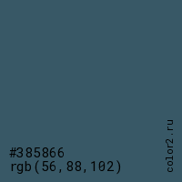 Цвет #385866 в цветовой модели RGB обозначается тремя октетами (56, 88, 102) в десятичном формате и #385866 в шестнадцатиричном (hex) формате, которые являются интенсивностью красного 56 (hex 38), интенсивность зелёного 88 (hex 58) и интенсивность синего 102 (hex 66).
