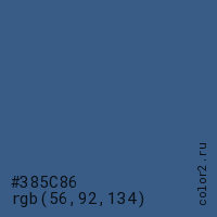 Цвет #385C86 в цветовой модели RGB обозначается тремя октетами (56, 92, 134) в десятичном формате и #385C86 в шестнадцатиричном (hex) формате, которые являются интенсивностью красного 56 (hex 38), интенсивность зелёного 92 (hex 5C) и интенсивность синего 134 (hex 86).