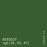 Цвет #385D2F в цветовой модели RGB обозначается тремя октетами (56, 93, 47) в десятичном формате и #385D2F в шестнадцатиричном (hex) формате, которые являются интенсивностью красного 56 (hex 38), интенсивность зелёного 93 (hex 5D) и интенсивность синего 47 (hex 2F).