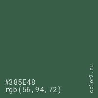 Цвет #385E48 в цветовой модели RGB обозначается тремя октетами (56, 94, 72) в десятичном формате и #385E48 в шестнадцатиричном (hex) формате, которые являются интенсивностью красного 56 (hex 38), интенсивность зелёного 94 (hex 5E) и интенсивность синего 72 (hex 48).