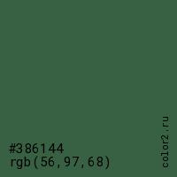 Цвет #386144 в цветовой модели RGB обозначается тремя октетами (56, 97, 68) в десятичном формате и #386144 в шестнадцатиричном (hex) формате, которые являются интенсивностью красного 56 (hex 38), интенсивность зелёного 97 (hex 61) и интенсивность синего 68 (hex 44).