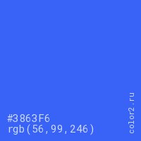 Цвет #3863F6 в цветовой модели RGB обозначается тремя октетами (56, 99, 246) в десятичном формате и #3863F6 в шестнадцатиричном (hex) формате, которые являются интенсивностью красного 56 (hex 38), интенсивность зелёного 99 (hex 63) и интенсивность синего 246 (hex F6).