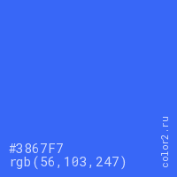 Цвет #3867F7 в цветовой модели RGB обозначается тремя октетами (56, 103, 247) в десятичном формате и #3867F7 в шестнадцатиричном (hex) формате, которые являются интенсивностью красного 56 (hex 38), интенсивность зелёного 103 (hex 67) и интенсивность синего 247 (hex F7).