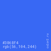 Цвет #3868F4 в цветовой модели RGB обозначается тремя октетами (56, 104, 244) в десятичном формате и #3868F4 в шестнадцатиричном (hex) формате, которые являются интенсивностью красного 56 (hex 38), интенсивность зелёного 104 (hex 68) и интенсивность синего 244 (hex F4).