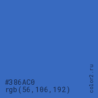 Цвет #386AC0 в цветовой модели RGB обозначается тремя октетами (56, 106, 192) в десятичном формате и #386AC0 в шестнадцатиричном (hex) формате, которые являются интенсивностью красного 56 (hex 38), интенсивность зелёного 106 (hex 6A) и интенсивность синего 192 (hex C0).