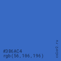 Цвет #386AC4 в цветовой модели RGB обозначается тремя октетами (56, 106, 196) в десятичном формате и #386AC4 в шестнадцатиричном (hex) формате, которые являются интенсивностью красного 56 (hex 38), интенсивность зелёного 106 (hex 6A) и интенсивность синего 196 (hex C4).
