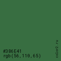 Цвет #386E41 в цветовой модели RGB обозначается тремя октетами (56, 110, 65) в десятичном формате и #386E41 в шестнадцатиричном (hex) формате, которые являются интенсивностью красного 56 (hex 38), интенсивность зелёного 110 (hex 6E) и интенсивность синего 65 (hex 41).
