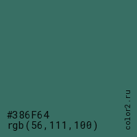 Цвет #386F64 в цветовой модели RGB обозначается тремя октетами (56, 111, 100) в десятичном формате и #386F64 в шестнадцатиричном (hex) формате, которые являются интенсивностью красного 56 (hex 38), интенсивность зелёного 111 (hex 6F) и интенсивность синего 100 (hex 64).