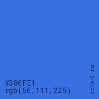 Цвет #386FE1 в цветовой модели RGB обозначается тремя октетами (56, 111, 225) в десятичном формате и #386FE1 в шестнадцатиричном (hex) формате, которые являются интенсивностью красного 56 (hex 38), интенсивность зелёного 111 (hex 6F) и интенсивность синего 225 (hex E1).