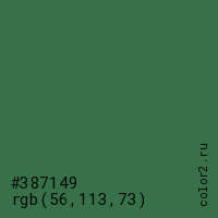 Цвет #387149 в цветовой модели RGB обозначается тремя октетами (56, 113, 73) в десятичном формате и #387149 в шестнадцатиричном (hex) формате, которые являются интенсивностью красного 56 (hex 38), интенсивность зелёного 113 (hex 71) и интенсивность синего 73 (hex 49).