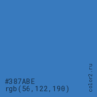 Цвет #387ABE в цветовой модели RGB обозначается тремя октетами (56, 122, 190) в десятичном формате и #387ABE в шестнадцатиричном (hex) формате, которые являются интенсивностью красного 56 (hex 38), интенсивность зелёного 122 (hex 7A) и интенсивность синего 190 (hex BE).