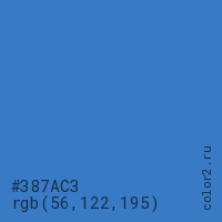 Цвет #387AC3 в цветовой модели RGB обозначается тремя октетами (56, 122, 195) в десятичном формате и #387AC3 в шестнадцатиричном (hex) формате, которые являются интенсивностью красного 56 (hex 38), интенсивность зелёного 122 (hex 7A) и интенсивность синего 195 (hex C3).
