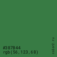 Цвет #387B44 в цветовой модели RGB обозначается тремя октетами (56, 123, 68) в десятичном формате и #387B44 в шестнадцатиричном (hex) формате, которые являются интенсивностью красного 56 (hex 38), интенсивность зелёного 123 (hex 7B) и интенсивность синего 68 (hex 44).