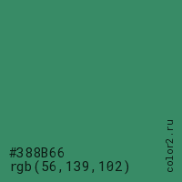 Цвет #388B66 в цветовой модели RGB обозначается тремя октетами (56, 139, 102) в десятичном формате и #388B66 в шестнадцатиричном (hex) формате, которые являются интенсивностью красного 56 (hex 38), интенсивность зелёного 139 (hex 8B) и интенсивность синего 102 (hex 66).