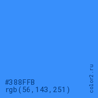 Цвет #388FFB в цветовой модели RGB обозначается тремя октетами (56, 143, 251) в десятичном формате и #388FFB в шестнадцатиричном (hex) формате, которые являются интенсивностью красного 56 (hex 38), интенсивность зелёного 143 (hex 8F) и интенсивность синего 251 (hex FB).