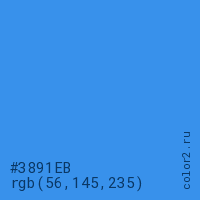 Цвет #3891EB в цветовой модели RGB обозначается тремя октетами (56, 145, 235) в десятичном формате и #3891EB в шестнадцатиричном (hex) формате, которые являются интенсивностью красного 56 (hex 38), интенсивность зелёного 145 (hex 91) и интенсивность синего 235 (hex EB).