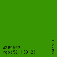 Цвет #389602 в цветовой модели RGB обозначается тремя октетами (56, 150, 2) в десятичном формате и #389602 в шестнадцатиричном (hex) формате, которые являются интенсивностью красного 56 (hex 38), интенсивность зелёного 150 (hex 96) и интенсивность синего 2 (hex 02).