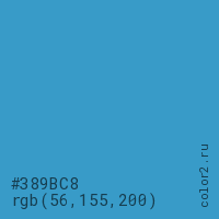 Цвет #389BC8 в цветовой модели RGB обозначается тремя октетами (56, 155, 200) в десятичном формате и #389BC8 в шестнадцатиричном (hex) формате, которые являются интенсивностью красного 56 (hex 38), интенсивность зелёного 155 (hex 9B) и интенсивность синего 200 (hex C8).
