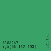 Цвет #38A267 в цветовой модели RGB обозначается тремя октетами (56, 162, 103) в десятичном формате и #38A267 в шестнадцатиричном (hex) формате, которые являются интенсивностью красного 56 (hex 38), интенсивность зелёного 162 (hex A2) и интенсивность синего 103 (hex 67).
