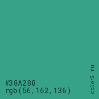 Цвет #38A288 в цветовой модели RGB обозначается тремя октетами (56, 162, 136) в десятичном формате и #38A288 в шестнадцатиричном (hex) формате, которые являются интенсивностью красного 56 (hex 38), интенсивность зелёного 162 (hex A2) и интенсивность синего 136 (hex 88).