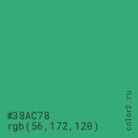 Цвет #38AC78 в цветовой модели RGB обозначается тремя октетами (56, 172, 120) в десятичном формате и #38AC78 в шестнадцатиричном (hex) формате, которые являются интенсивностью красного 56 (hex 38), интенсивность зелёного 172 (hex AC) и интенсивность синего 120 (hex 78).