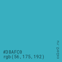 Цвет #38AFC0 в цветовой модели RGB обозначается тремя октетами (56, 175, 192) в десятичном формате и #38AFC0 в шестнадцатиричном (hex) формате, которые являются интенсивностью красного 56 (hex 38), интенсивность зелёного 175 (hex AF) и интенсивность синего 192 (hex C0).